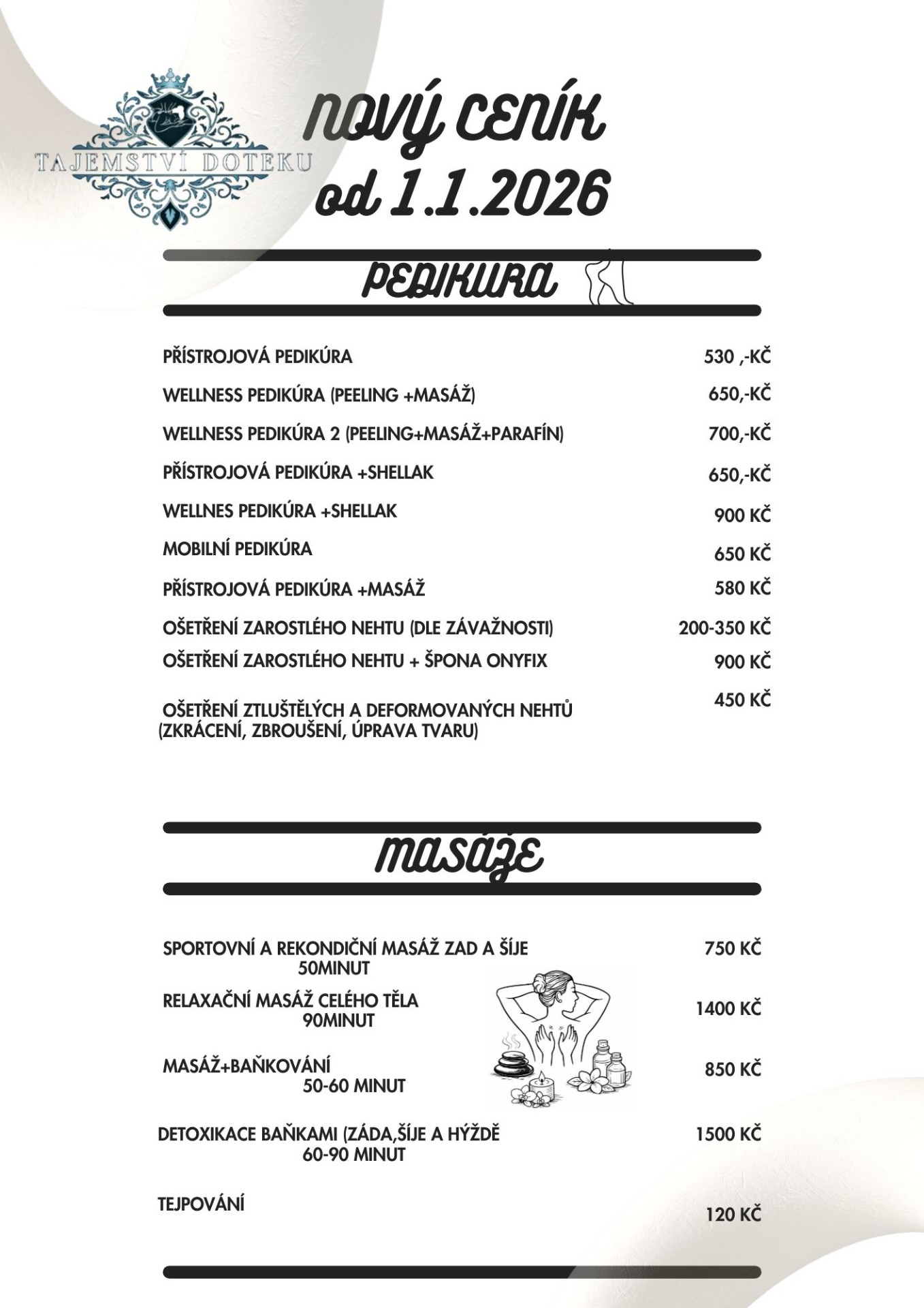 Wellness pedikúra (základní ošetření, peeling, masáž nohou) v případě lakování nehtů + 50,- Kč